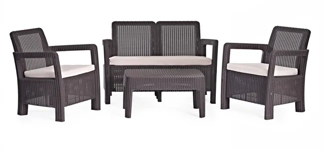 Set de muebles de resina, modelo Diva Confort Storage, para decoración de zonas exteriores como jardines y terrazas. Mobiliario de alta calidad, montaje rápido y sencillo, sin componentes metálicos para así evitar la oxidación, fabricado con materiales reciclados, resistente a los rayos UV y las inclemencias del tiempo. Conjunto compuesto por dos sillones individuales, un sofá y una mesa storage que permite guardar todo lo que necesites. Color: Grafito. Medidas sillón (AlxProfxL): 72x66x74 cm. Medidas sofá (AlxProfxL): 72x66x132 cm. Medidas mesa (AlxProfxL): 43x65x65 cm.